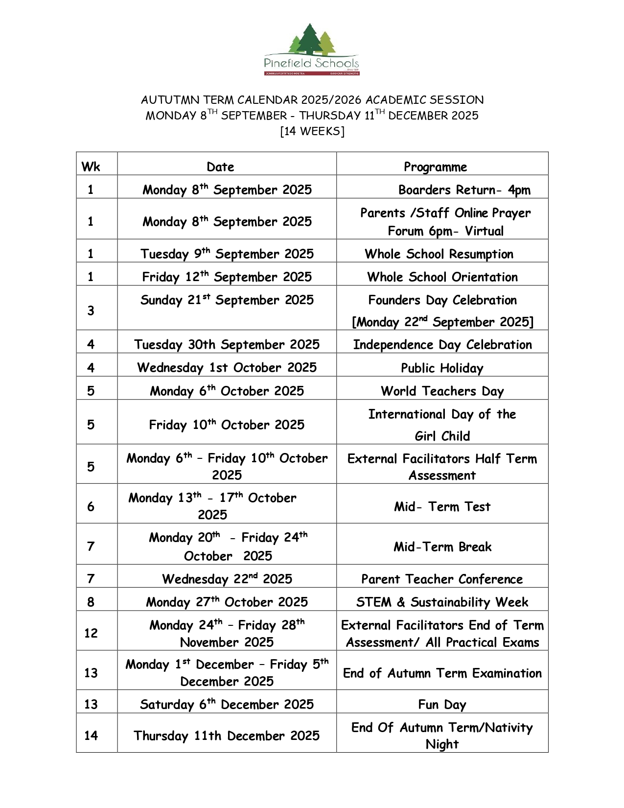 Autumn Academic Session resumes Monday, 8th September 2025 and ends Thursday, 11th December 2025