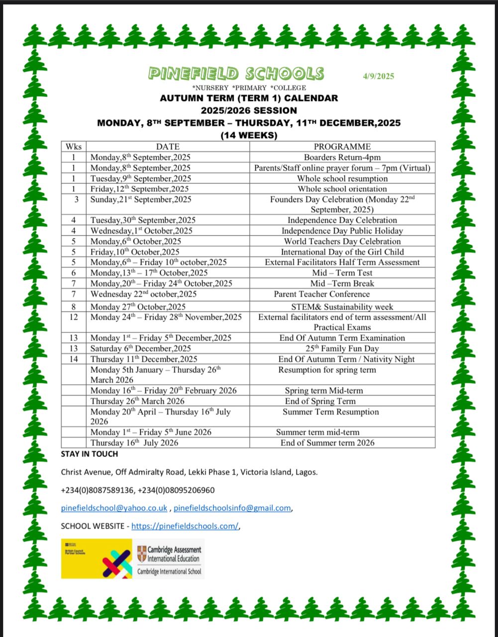 Autumn Term (Term 1) 2025/2026 Academic Session starts Monday, 8th September 2025 and ends Thursday, 11th December 2025